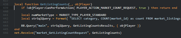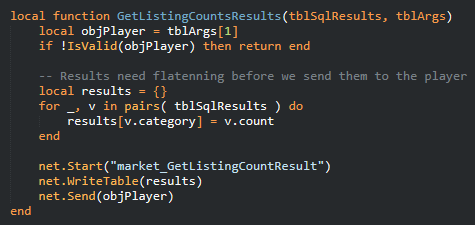 So, we run a query, the database runs the query, returns the results, and then the callback (GetListingCountsResults) is executed (line 444), which contains the data we want as an arg (see below). We then do whatever we need to do to that – in this instance, we send the counts for each category to the player (Using WriteTable is expensive for net messages, I know! But it’s rare and I was lazy).